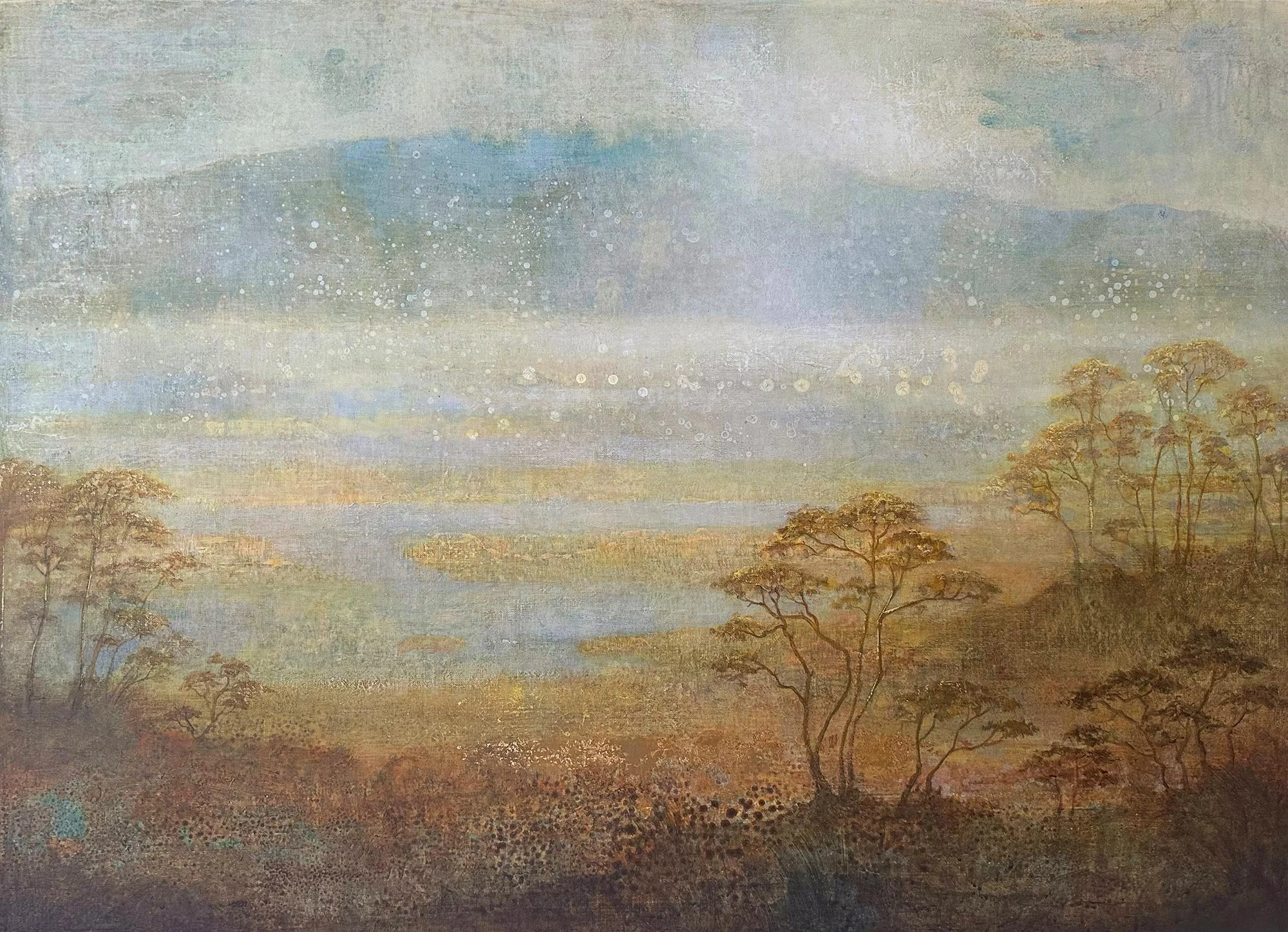 Sur papier marouflé, toile de lin ou panneau de châtaignier, les œuvres de Claire Degans se caractérisent par des strates superposées, des transparences et des patines qui confèrent aux surfaces une profondeur organique. La palette, composée de teintes naturelles, et l’utilisation ponctuelle de la feuille d’or inscrivent ces paysages dans une forme d’intemporalité silencieuse.